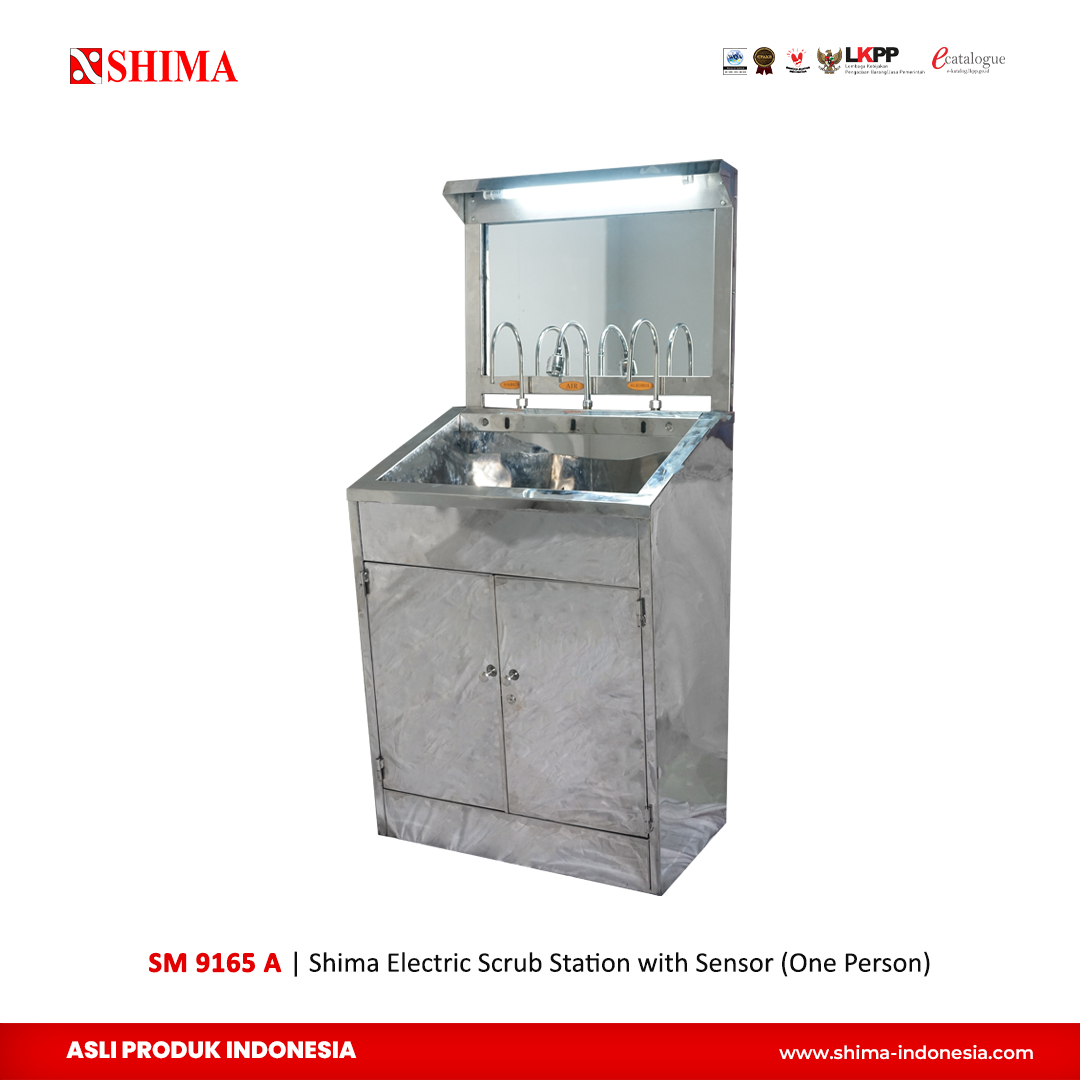 SHIMA ELECTRIC SCRUB STATION WITH SENSOR (ONE PERSON) SM 9165 A merupakan perangkat pencuci tangan medis otomatis yang dirancang untuk digunakan di ruang persiapan operasi atau area sterilisasi. Unit ini terbuat dari material stainless steel dan dilengkapi sensor untuk air, sabun, dan alkohol, guna meminimalkan kontak langsung dan menjaga kebersihan selama proses cuci tangan.