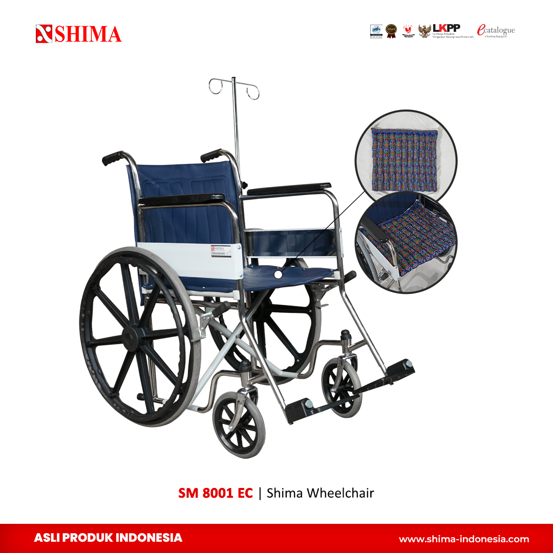 SHIMA Wheelchair EC SM-8001 E.Cat dirancang untuk kebutuhan transportasi pasien dengan fitur tambahan untuk kenyamanan dan kemudahan perawatan. Rangka kursi roda ini menggunakan pipa baja berlapis coating tahan lama, serta memiliki dimensi 1000mm (P) x 660mm (L) x 880mm (T). Dengan ban depan 8 inci dan ban belakang 24 inci bertipe solid dengan velg ABS, kursi roda ini memberikan dukungan mobilitas yang stabil dan minim perawatan.